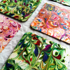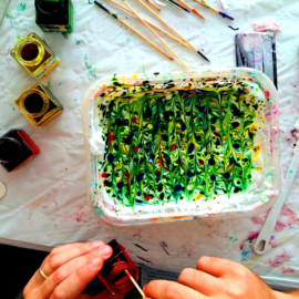 L’atelier Marbrure propose aux participants de plonger dans la technique ancestrale du papier marbré aussi appelée « Ebru ». Chaque participant pourra faire ses propres papiers marbrés en laissant libre court à son imagination en s’émerveillant du résultat riche en couleurs et en motifs ! Les fonds crées avec la technique de la marbrure pourront être, dans un second temps, transformer par le dessin, le collage et le bricolage pour fabriquer des petits objets du quotidien tels que des cartes de vœux, marque-page, mobile, etc… A partir de cette technique ancienne adaptée au goût du jour, les participants pourront mettre à profit la marbrure pour développer leur créativité avec simplicité!